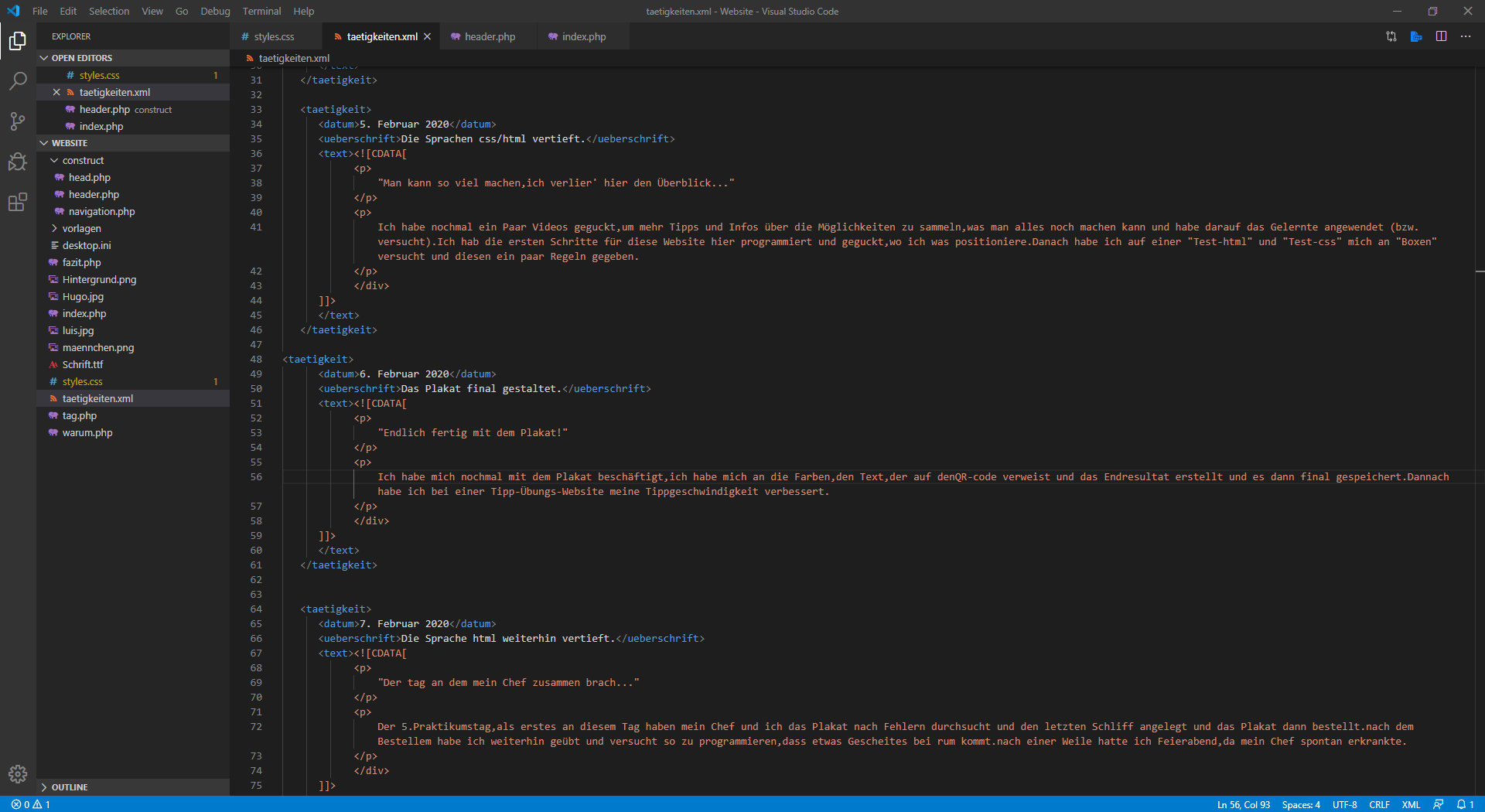 Als erstes habe ich mit Hilfe eins YouTube Viedeos dei ersten Schritte des Programmierens einer Webseite gelernt (das Grundgerüst). Nach ein paar Viedeos und Tipps habe ich selbst versucht und ausprobiert was alles möglich ist. Ich habe Überschriften, Bilder und Texte "programmiert" und versucht diese anschaulich darzustellen.