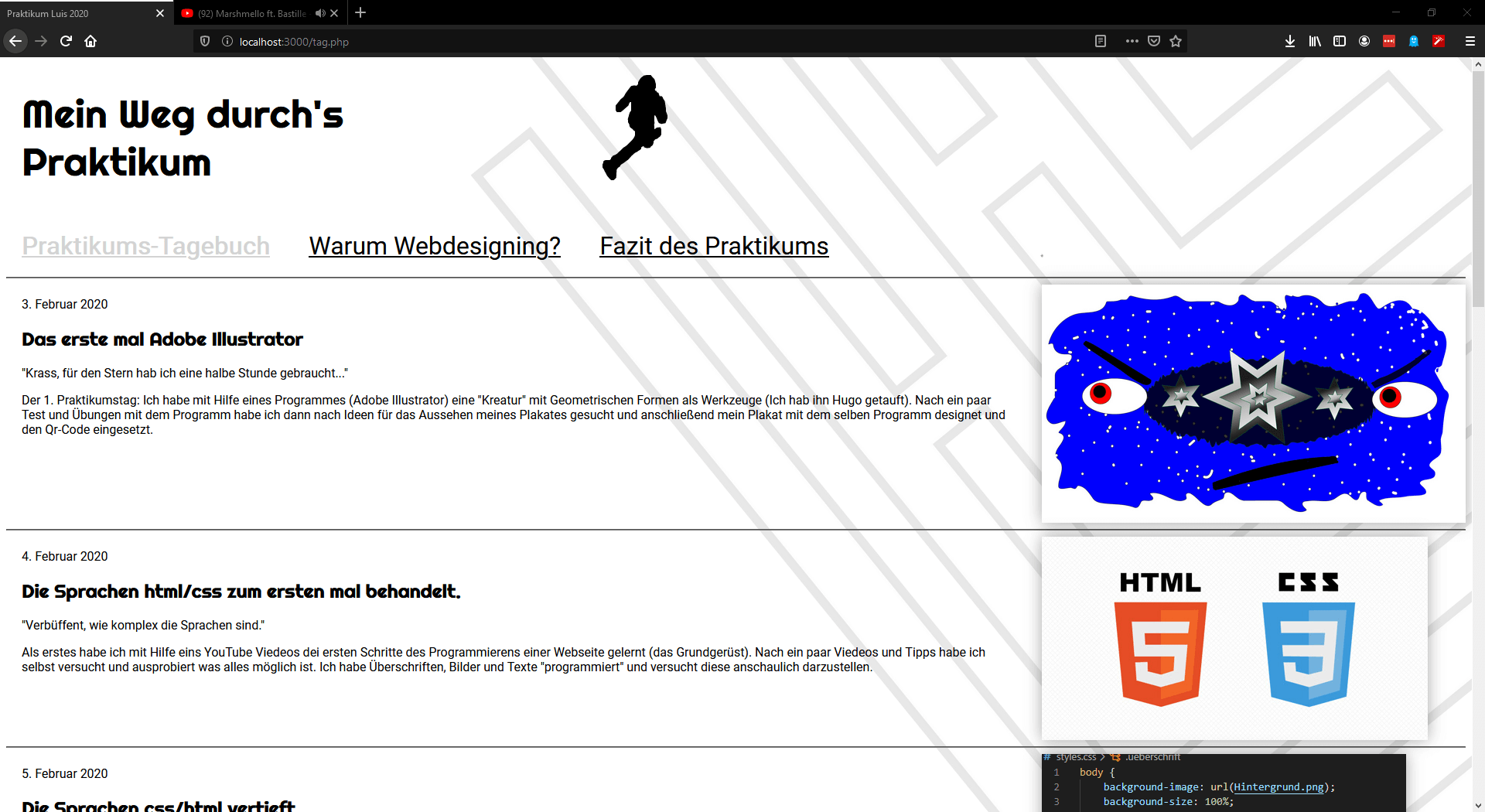 Ich habe nochmal ein Paar Videos geguckt, um mehr Tipps und Infos über die Möglichkeiten zu sammeln, was man alles noch machen kann und habe darauf das Gelernte angewendet (bzw. versucht). Ich hab die ersten Schritte für diese Website hier programmiert und geguckt, wo ich was positioniere. Danach habe ich auf einer "Test-html" und "Test-css" mich an "Boxen" versucht und diesen ein paar Regeln gegeben.