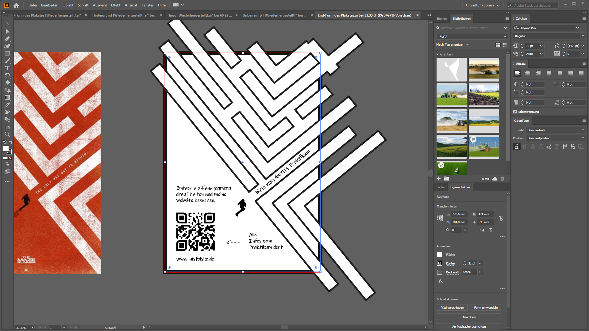 Der 1. Praktikumstag: Ich habe mit Hilfe eines Programmes (Adobe Illustrator) eine "Kreatur" mit Geometrischen Formen als Werkzeuge (Ich hab ihn Hugo getauft). Nach ein paar Test und Übungen mit dem Programm habe ich dann nach Ideen für das Aussehen meines Plakates gesucht und anschließend mein Plakat mit dem selben Programm designet und den Qr-Code eingesetzt.